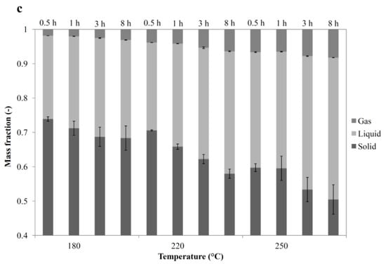 Although the data are very variable, in general at 180 °C the mass of carbon within the liquid tends to decrease with time. This can be due to polymerization reactions that involve organic molecules in the liquid phase, which solidify producing secondary char, according to the definition given by Müller and Vogel [39]. Another cause of the decrease of the carbon in the liquid can be the formation of gaseous compounds (carbon dioxide and carbon monoxide, Section 3.3).