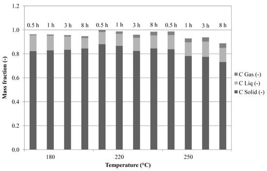 Generally, the longer the residence time and the higher the temperature, the lower is the hydrochar yield. Moreover, the mass lost by the feedstock during the process tends in proportion to move more to the gaseous phase than to the liquid phase. In particular, at longer residence times the liquid production tends to be lower, in proportion, than the gas released, since the gas production is slightly enhanced. This fact can be explained considering that, as the residence time increases, the compounds, which were solved in the liquid phase, degrade into gaseous compounds more and more. Thus, a part of the liquid compounds contributes to the formation of the gases. At higher temperatures, the gasification reactions occur faster than at lower temperatures: this fact can explain why at 250 °C the distribution of the mass lost during HTC between liquid and gas seems to be slightly time independent. Moreover, to analyze the carbon distribution between the three phases, the carbon balance for grape seeds was calculated and is reported in Figure 5.