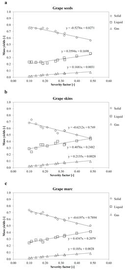 Similar results were obtained by using SFR0 to hydrothermally carbonized grape seeds, skins and marc (data not shown). Even in this case, the description of the solid yields was quite good, having absolute errors ranging between 0.31 and 7.1%, while both liquid and gaseous phase presented in more than one case absolute errors higher than 10%. However, once the description of the mass yield in terms of SF is improved, it could allow finding different couples of temperature and residence time that give the same value of SF, which corresponds to a mass yield value. For example, performing HTC at 220 °C for 8 h gives almost the same SF (i.e., SF = 0.32) as at 250 °C for 1 h. Thus, the mass yields of the three phases obtained at this SF conditions should be similar. This clearly happens for grape skins and marc, while for grape seeds the difference (especially for the solid mass yield) is more evident.