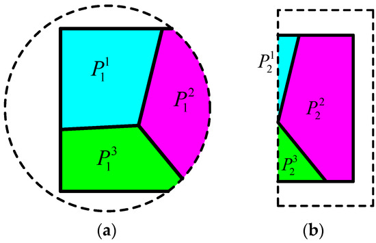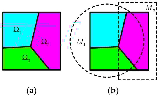 To clarify, a simple example is presented to illustrate the process of constructing the NMM cover system. Figure 2a shows a problem domain is subdivided into three separate blocks, i.e., , and , by its physical meshes. To discretize , two MCs, i.e., and in Figure 2b, are generated to completely cover . Then, is subdivided into three PCs, termed as , and (Figure 3a), whereas is subdivided into three PCs, termed as , and (Figure 3b), by the physical meshes. The six PCs partly overlap each other and cut into seven MEs, as shown in Figure 4.