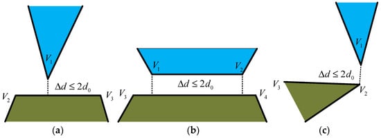 The NMM inherits the contact theory from DDA to deal with block movements and block interactions [19]. To avoid large displacements in a single time step, a maximum permissible displacement is prescribed in the NMM. Generally, the contact detection process of the NMM can be divided into two separate steps. The first step is detecting the possible contact pairs. The block pair is considered as a possible contact pair if the minimum distance between two blocks is no more than . Basically, three types of contact are defined in the NMM after possible contact detection, i.e., the angle-to-edge contact, the edge-to-edge contact and the angle-to-angle contact, as shown in Figure 5a–c, respectively.