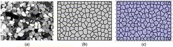 To more realistically model the thermo-elastic fracturing of the rocklike granular materials, the microstructure of these materials should be considered. The microstructure of the rocklike granular materials appear much like random polygons, as shown in Figure 7a [40]. The Voronoi tessellation is introduced into the pre-processor of the NMM to represent the randomness of the microstructure of granular materials [42]. The Voronoi tessellation begins with generating a set of random points. These random points can be moved step-by-step through an iteration procedure to make the space between the points more uniform. Then triangulation is carried out based on these random points. Following that, the Voronoi polygons are generated by constructing the perpendicular bisectors of all the triangle edges. Finally, by truncating the Voronoi polygons at the boundaries, the random microstructure of granular material is established (Figure 7b). The random microstructure is then treated as the physical meshes of the NMM pre-processor, and the NMM model for granular material finally is constructed by the pre-processor of the NMM (Figure 7c).
