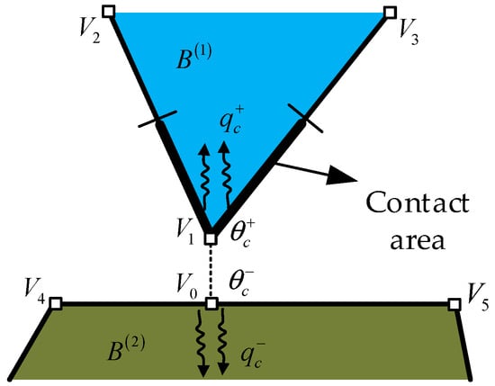To explain the contact-based heat transfer model in detail, a representative example is shown in Figure 9, in which block contacts block at point of and point of respectively. The contact status of this contact pair is represented with the point-edge relation -. The heat interactive between and is then approximated by the heat interactive between boundary and point .