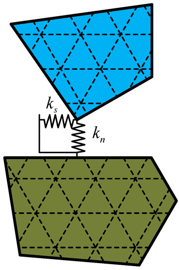where and are the normal contact force and the tangential contact force, respectively. and are the corresponding normal contact stiffness and tangential contact stiffness, respectively. The selection of normal and tangential stiffness can greatly influence the output of the numerical model. According to Shi’s suggestion, the ratio of the contact stiffness to the elastic modulus of the block is preferably between 20 and 100 [19].