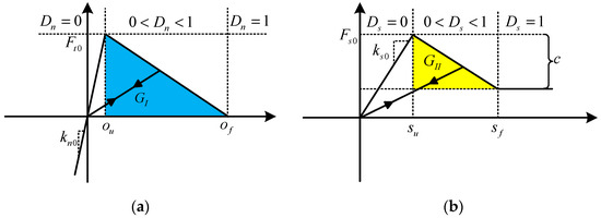 As mentioned in Section 2.1.2, after the invasion judgement, the invasion status of contact block pairs are obtained. Generally, the interactions among grains are divided into normal behavior and tangential behavior. In NMM, normal contact springs and tangential contact springs are adopted to simulate the normal behaviors and tangential behaviors among blocks as shown in Figure 10. To be consistent with this and to simulate the cohesion effects among blocks as well, the normal force-aperture relationship shown in Figure 11a and the tangential force-aperture relationship shown in Figure 11b are adopted and assigned to the normal spring and tangential spring respectively. Correspondently, to reflect the damage evolution process of the cemented interface, two damage factors, i.e., the normal damage factor and the tangential damage factor , are defined for the normal contact spring and tangential contact spring respectively. The normal behavior and tangential behavior of the damage based contact fracture model are described in detail as follows.