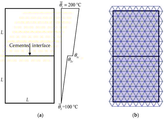The thermal conduction in a plane consists of two square blocks is simulated in this example to verify the effectiveness of the developed contact heat transfer model. The edge length of the square blocks is L = 1.5 mm. The plane is subjected to prescribed temperature conditions on the top boundary and bottom boundary, as shown in Figure 12a. The two blocks are bonded together by the center cemented interface. The heat transfer across the cemented interface should influence the temperatures on the two sides of the cemented interface, which is termed as and in this example. The steady state theoretical solutions for and can be calculated according to the following equations [43]: