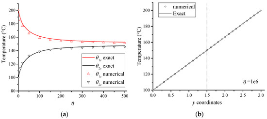 The NMM cover system shown in Figure 12b is constructed to implement the numerical simulation. The numerical results of and for cases with different η are compared with the corresponding theoretical solutions in Figure 13a, which indicates good agreements. Moreover, it is illustrated in Figure 13 that the temperature difference at the cemented interface decreases with the increase of η. Therefore, it is inferred that when η is large enough, the interface temperature difference would diminish to 0. To validate this point of view, Figure 13b shows the temperature on the center vertical line of the plane for case with η = 1 × 106. Obviously, the temperature agrees well with the exact temperature solution of a continuous plane with the same size and boundary conditions.