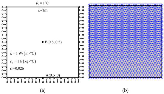A simple thermo-mechanical coupling problem is analyzed to validate effectiveness of the extended NMM on simulating thermo-mechanical coupling problems. As shown in Figure 14a, a square plane with edge length L = 1 m and initial temperature is subjected to thermal loading on the top boundary. The vertical displacement of the bottom boundary as well as the horizontal displacements of the right boundary and left boundary are fixed. The plane is subjected to plane strain conditions.
