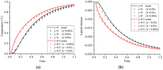 According to thermodynamics, the heat flux would flow gradually from the top boundary to the bottom boundary. The resulting temperature variation could cause thermal expansion and thermal stresses in the plane. To investigate these phenomenon, this transient heat transfer process is numerically simulated by the extended NMM. The variation of the temperatures and lateral stresses at point A (0.5, 0) and point B (0.5, 0.5) with time for cases with different time step sizes are extracted and investigated as shown in Figure 15a,b. To compare, the corresponding theoretical solutions for the temperatures and stresses are obtained according to the following equations [47]: