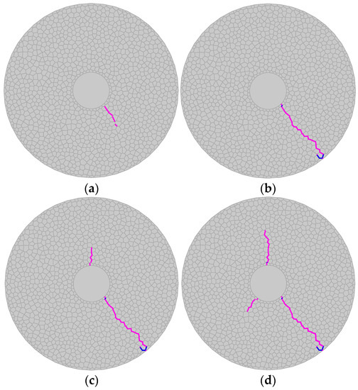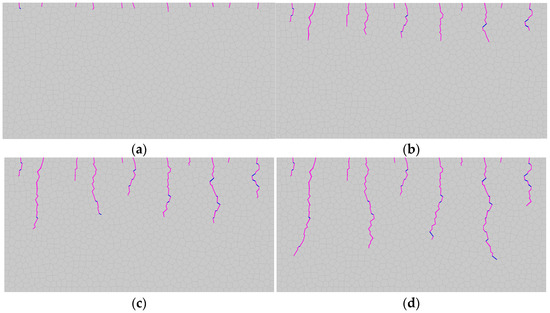 The numerical results of the thermal fracturing process are shown in Figure 20. During the numerical simulation, an array of small fractures emerge at the top boundary of the plane immediately after the cooling process starts, which is due to the large temperature gradient near the top boundary (Figure 20a). These small fractures propagate downwards as the plane cools gradually from the top boundary to the bottom boundary. Additionally, the number of fractures that continue to grow downwards decrease monotonically. Generally, the ultimate thermal fracture patterns are mainly in the vertical direction, which is parallel to the average temperature gradient. However, due to the heterogeneity of the grain structure, the thermal fracture patterns are slightly deviated from the vertical direction. This numerical result is consistent with that obtained by Huang [50].