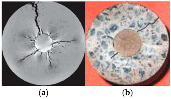 The NMM cover system with 11,187 MEs and 10,955 PCs are generated to simulate this problem (Figure 16b). According to the analysis of Example 2, the time step size adopted for the numerical simulation is . During the numerical simulation, the temperature of the model is increased uniformly by per time step. The numerical results of the thermal fracturing processes are shown in Figure 17. A fracture initiates at the lower right corner of the cylinder first (Figure 17a). This fracture propagates rapidly until it completely cut-through the cylinder at (Figure 17b). Subsequently, two secondary fractures initiate at the upper left and lower left corners of the cylinder at (Figure 17c) and (Figure 17d), respectively. Similar numerical simulation of this example has been conducted by the RFPA-thermal [12]. Figure 18a shows the final thermal fracture morphology of the RFPA-thermal, in which one main radial fracture that cut-through the outer cylinder as well as some shorter secondary radial fractures are also obtained. A similar experiment test has also conducted by Abdalla [49]. In Abdalla’s experiment test, a concrete prism symmetrically reinforced by FRP bars is subjected to uniform rise of temperature. The thermal expansion coefficient of FRP in the test is much larger than that of the concrete. As a result, transverse thermal stresses gradually increase in the concrete, which further leads to the radial fracturing in the concrete surrounding the FRP bars. Figure 18b shows the thermal fracture morphology of the test. Similar to the numerical results, one main radial fracture is initiated and finally cut-through the surrounding concrete. Along with the main fracture, there are also some shorter radial fractures in the surrounding concrete.