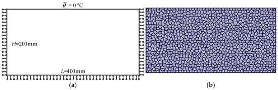 The thermo-elastic fracturing of a plane made of granular material induced by cooling is studied in this example. The length and height of the plane are L = 400 mm and H = 200 mm respectively, as shown in Figure 19a. The vertical displacement of the bottom boundary as well as the horizontal displacements of the left and right boundaries are fixed, while the top boundary is mechanically free. The plane is originally subjected to a high temperature circumstance with initial temperature . The left, right and bottom boundaries are adiabatic. The top boundary is held at a prescribed temperature of to mimic the contact of the plane with cold, e.g., rapidly flowing cold water.