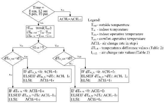 The energy modelling tool EnergyPlus [40], which allows integrated calculations of the transfer of mass and energy inside the building, was used for the simulation and calculation of the energy demand and thermal comfort. The EMS (Energy Management System) module of this program enables the users to program their own functions to develop custom control and modelling routines. This module was used to program the ventilation controller, which is to imitate the control of ambient airflow supply by the inhabitants. The controller based on “if-then” rules is proposed here. It was assumed that input data for the infiltration controller (IC) can only be temperature. The IC does not take into account all the information about weather (e.g. speed and wind direction) that have occupants before changing the window opening. Consequently, it was assumed that the controller will calculate the air change rate (ACH), not the degree of window opening. In the program, it was modelled as a change in infiltration rate.