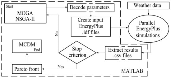A large number of techniques and algorithms have been developed for the optimum design of technical problems. Evolutionary algorithms, especially genetic algorithms (GAs) are popular and advanced optimization tools for a wide spectrum of structural problems [20]. The advantages of GAs, as well as population-based meta-heuristic algorithms, are: the ability to deal with discrete set of design variables, the global convergence and no need for derivatives of objective functions. GAs are search algorithms based on ideas of natural selection and genetics (selection, crossing and mutation). Although GAs do not guarantee finding the global optimum, they have become an advanced optimization tool for a wide range of problems. An optimization tool in studies is often connected with simulation program to find the best combination of design parameters. Simulation tools can predict the effects of design variables on building energy consumption [3]. The studies have been performed for residential buildings and for one or different climates using TRNSYS (University of Wisconsin, Madison, WI, USA) [21,22], EnergyPlus (U.S. Department of Energy’s, Washington, DC, USA) [2,23,24], DOE-2 (Lawrence Berkeley National Laboratory, Berkeley, CA, USA) [17,18], eQUEST (Energy-Models.com, San Francisco, CA, USA) [25] simulation programs.