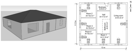A single-family detached house without a cellar and with an unusable attic was chosen for the research. The total area of rooms is 150 m2 and the height of rooms is 2.6 m. The ground floor of the building is shown in Figure 3. The selected building form enables different positioning of windows, which is the assumption of this study. The walls are of brick construction with polystyrene insulation (U = 0.22 W/m2K), the ceiling is a ferroconcrete structure with mineral wool insulation (U = 0.18 W/m2K) and the roof is covered with ceramic tiles and is uninsulated. This building structure is typical of single-family buildings in Poland. Parameters of the materials and acceptable options are presented in Table 2. The building is naturally ventilated and equipped with a hot water central heating system. A natural gas boiler is utilized to generate hot water supplied to radiators. The heating set point is kept at 22 °C [41], but between 10 pm and 5 am night time decreases of 3 K have been assumed. The windows have blinds that are drawn when the indoor temperatures and solar radiation are too high.