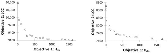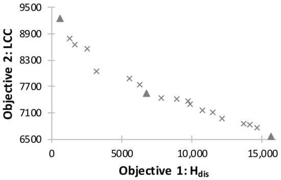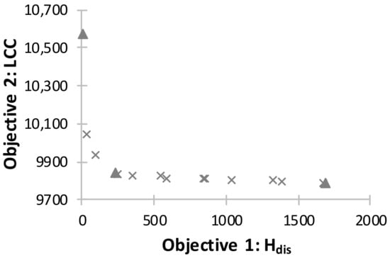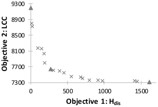 Simultaneous reduction of LCC and Hdis involves conflicting objectives. Since these two functions are nonlinear and additionally discrete values of design variables, it was assumed the global multi-objective optimization method (genetic algorithms) is used in order to obtain optimal results. As this study involves two objective functions for optimization, a multi-objective genetic algorithm (MOGA) was used. It is based on Pareto-dominance. Unlike classical weighted-sum approach, MOGA gives more solutions. NSGA-II is applied in this work. This method is the most widely used in environment engineering research.