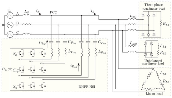 The dual HPF based on the NSI [27] connected to a three-phase electrical system is shown in Figure 1. There are three different loads connected to the system: (1) a linear load to absorb reactive power, imposing a low power factor; (2) a three-phase non-linear load that produces mainly 5th, 7th, 11th, and 13th harmonics and that causes distortion in the grid currents; (3) a single-phase non-linear load that produces mainly 3rd harmonics and that becomes dominant with great contribution to the total harmonic distortion. The harmonics produced by the non-linear loads make the grid current harmonics levels above the recommended limits [29]. Therefore, the dual HPF is connected at the PCC to provide harmonics currents and to compensate reactive power. Each HPF unit has output terminals connected in series with an LC passive filter, where the LC filters for each unit are tuned in different frequencies.