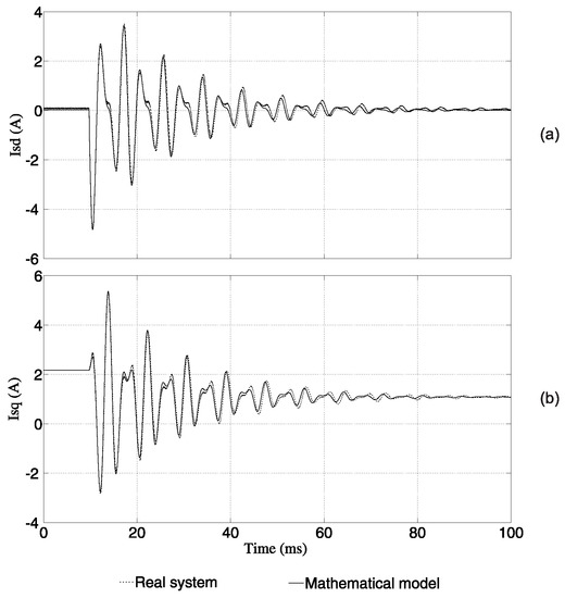 The currents of the model obtained in Equation (21) and the real system currents during the transient period are seen in Figure 3. This transient period occurs due to a step in . The currents and obtained from the mathematical model and the real system are similar and both stabilize and converge to the same reference. Therefore, it can be stated that the mathematical model is consistent with the real system dynamics.