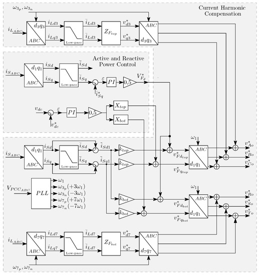 The reference voltages of the reactive power, dc-link voltage, feedback, and feedforward (third harmonic) controls are added for composing the reference voltages of the top unit. The reference voltages of the reactive power and feedforward (seventh harmonic) controls are added for composing the reference voltages of the bottom unit.