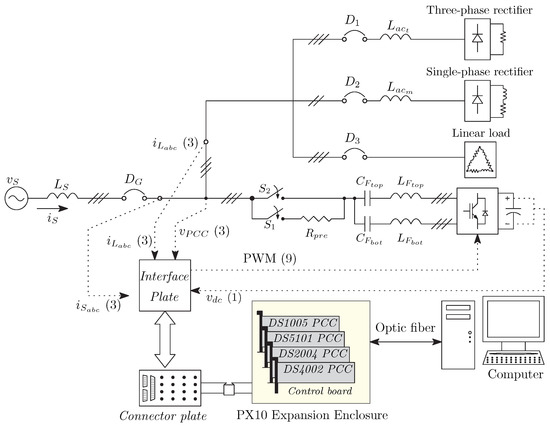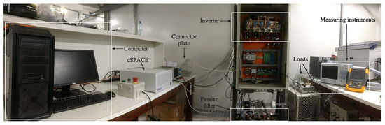 A DHPF-NSI prototype was built using an insulated-gate bipolar transistor (IGBT) with a switching frequency of 20 kHz [35,36]. The general diagram of the experimental setup is shown in Figure 5. The hardware platform used to control the Dual Hybrid Power Filter inverter is a dSPACE development modular system based on a DS1005 processor board [37] and several boards for each special hardware task, i.e., a DS5101 board for Pulse-Width Modulation (PWM) generation [38], a DS2004 board for Analog/Digital (A/D) conversion [39], and a DS4002 board for Digital Input/Output (I/O) [40]. All boards are hosted in a dSpace PX10 expansion box that uses the DS817 board for bidirectional communication with a Personal Computer (PC) through optical fibers. The signals measured from the system are the grid currents , load currents , filter currents , and line-to-line voltages . A general view of the experimental test bench is shown in Figure 6. The prototype parameters can be seen in Table 2. The top unit LC filter is tuned to 300 Hz to mitigate the 5th harmonic and to contribute to low order current harmonics compensation. The bottom unit LC filter is tuned to 660 Hz to mitigate the 11th harmonic and to contribute to high-order current harmonics compensation.
