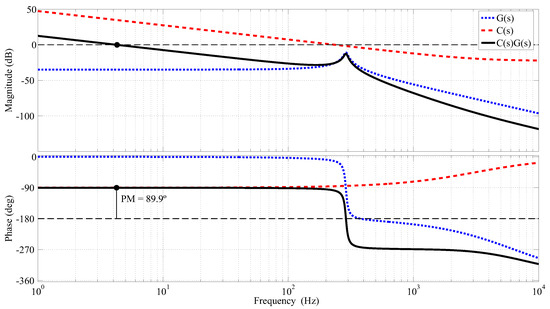 In order to verify the stability of the reactive power control system, the frequency response of the plant, in Equation (24), the controller, in Equation (25), and the open-loop transfer function, , are shown in Figure 7, using the data in Table 2 and Table 3. As can be seen, the designed controller has an infinite gain for dc (0 Hz) components, ensuring zero steady-state error in the reactive power control, and imposes a phase margin (PM) around 90 for the open-loop transfer function, which denotes a stable system. The cut-off frequency, 4.2 Hz at 0 dB, is sufficient to produce a step response with a settling time around 147 ms, very close to 150 ms, which is the value used for the controller design.