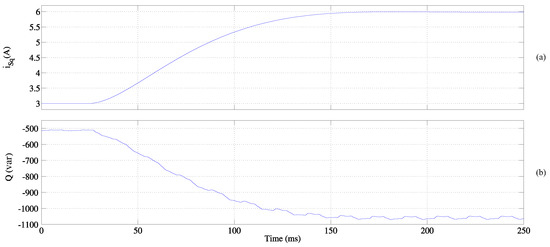 Step responses for a change from 3 A to 6 A in at 25 ms: (a) current injected by the DHPF-NSI; (b) reactive power generated by the DHPF-NSI.