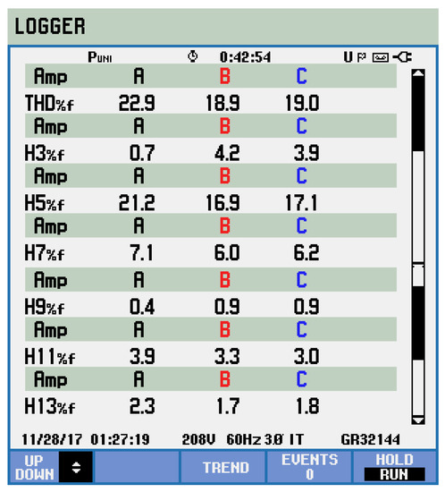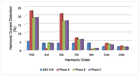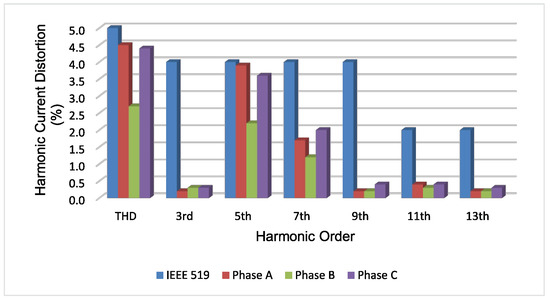 With the DHPF-NSI is disabled, the currents waveforms and the THDs for the three-phase grid currents are shown in Figure 9 and Figure 10. The load currents present high harmonic values that are well above the limits recommended in Table 4 [29]. Based on Table 4 and Figure 9, it is possible to build the current harmonic profile of the grid currents with the DHPF-NSI disabled, which is shown in Figure 11.