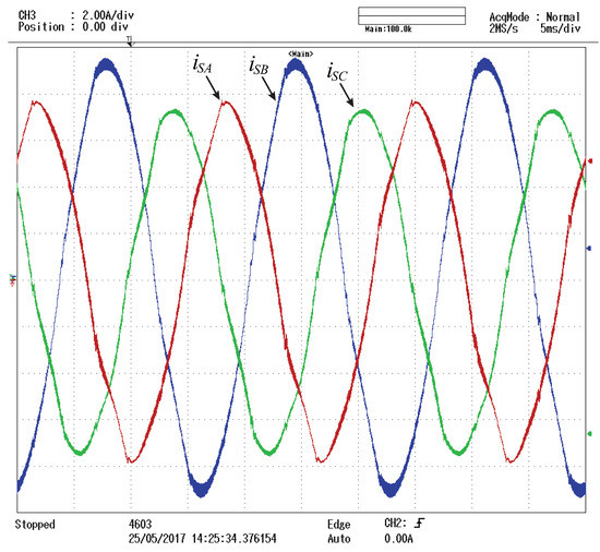 Three-phase grid current waveforms with the DHPF-NSI enabled.