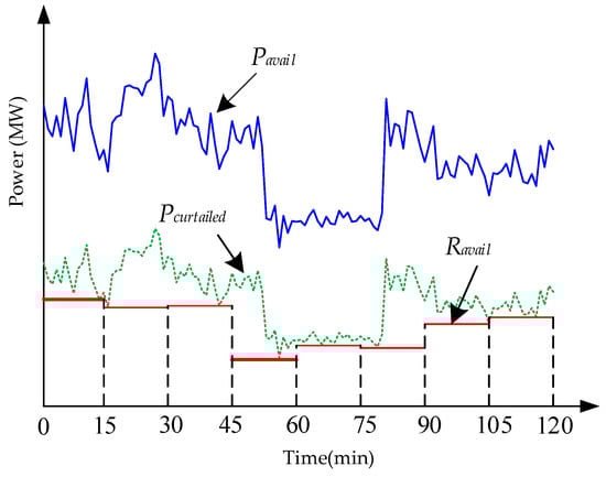 Within 15 min, the output power of the wind farm varies with the wind speed. From Equation (1), it can be known that when the coefficient of wind curtailment α is a fixed value and the maximum power of wind farms is changeable, the capacity of the wind curtailment by the proportional curtailment strategy also will be changeable. In order to make sure of how much the reserve of the primary frequency regulation by the wind farms can be provided within the 15 min, the minimum capacity of the wind curtailment within the 15 min is necessary. The effective reserve capacity of the wind farms Ravail can be seen in Equation (2) and the schematic diagram is shown in Figure 2.