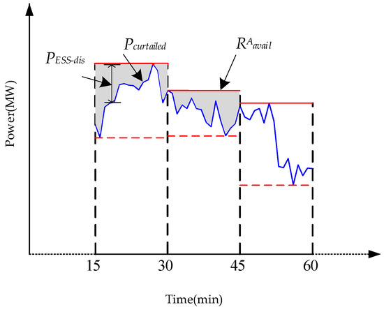 where n is wind power data point within 15 min, Pcurtailed(i) represents the corresponding capacity of the wind curtailment at the i moment, and its schematic diagram is shown in Figure 4. The slant shadows are the discharge of ESS in the first and third 15 min. The point shadows are the charge of ESS in the first and third 15 min.