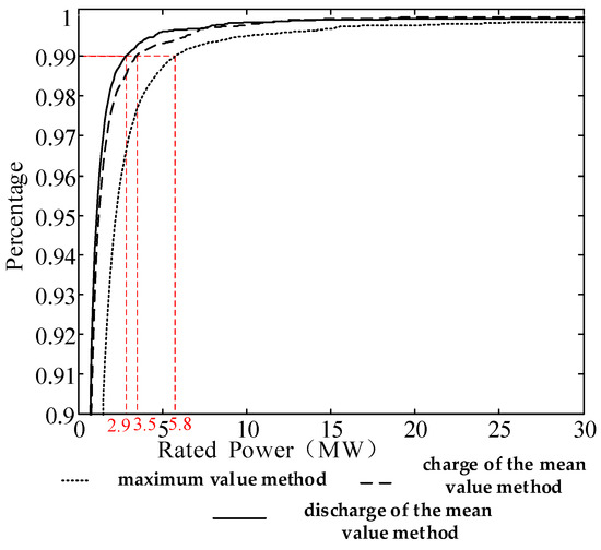 When the mean value method is adopted, the charging power and discharging power of ESS are determined according to the Equations (7)–(9). The cumulative probability distribution statistics of the charge and discharge events are shown in Figure 8. As shown in the diagram, the probability of discharge power at 3.5 MW is only 1%. Taking into consideration the economy of the energy storage system, we find that PBrate = 3.5 MW.