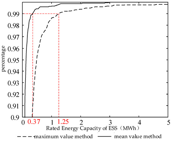 When the mean method is adopted, the accumulative probability distribution of energy storage capacity is shown in Figure 9 The energy storage capacity with mean value method is over 0.37 MWh, with only 1%. Thus, EBrate = 0.37 MWh.