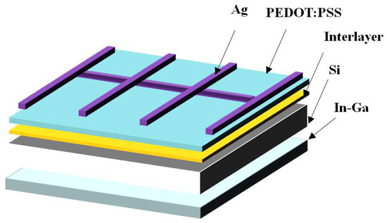 Si/organic hybrid solar cells utilizing poly(3,4-ethylenedioxythiophene):poly (styrenesulfonate) (PEDOT:PSS) combined with an n-type silicon (n-Si) have attracted significant research interest in recent years due to their obvious advantages of a low-temperature process, remarkably low fabrication cost, and potential high efficiency [1]. In this type of hybrid solar cells, as shown in Figure 1, the PEDOT:PSS layer acts as a hole transporting path [2] when forming a heterojunction with the n-type Si substrate. Si has a strong absorption ability in a very wide spectrum range and excellent carrier transport ability. PEDOT:PSS is a water-soluble polymer which has a high conductivity, a transmission window in the visible spectral range, and excellent chemical and thermal stability. This type of Si/PEDOT:PSS hybrid solar cell combines the superior absorption property of Si in a wide spectrum range and the advantage of aqueous solution-based processes of PEDOT:PSS. Over the past few years, considerable progress towards creating highly efficient hybrid n-Si/PEDOT:PSS solar cells has been achieved by adjusting major factors such as electrical conductivity, chemical affinity, and passivation on the device surface [3,4,5,6,7,8,9]. Sun et al. introduced perovskite nanoparticles to the PEDOT:PSS layer to generate a positive electrical surface field [10]. Pham et al. presented adding functionalized graphene to the PEDOT:PSS solution based on Silicon nanowire (SiNW), and demonstrated an enhancement of photoelectric conversion efficiency (PCE). Wen et al. [11] fabricated an n+ amorphous silicon layer on the back of the c-Si, which could significantly improve the extraction of the photon-generated carrier and suppress the recombination of hole electrons at the rear cathode [12]. Despite significant efforts to improve solar cell performance, the highest power conversion efficiency (PCE) reported to date is still low when compared to the value theoretically estimated by Shockley–Queisser for a single-junction device [13].