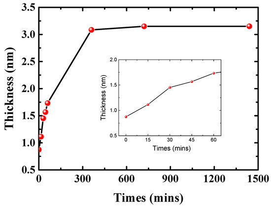 Figure 2 shows the oxide thickness (dox) of the Si substrates after exposure in air for different time periods. The thickness is measured by using the J. A. Woollam spectroscopic ellipsometer by fitting the ellipsometric data in the wavelength range of 300–1200 nm under an angle of incidence of 75°. When the substrate is immersed in the dilute HF solution, the native oxide is easily removed and the Si surface becomes the hydrogen-terminated (H-terminated) surface. The wettability of the H-terminated Si surface is poor, and it will lead to a bad surface coverage when the PEDOT:PSS is deposited later. Once the Si substrate is exposed in the air, the oxygen tends to react with the Si and form the SiOx. After the Si substrate is taken out from the HF solution, we try to measure the SiOx thickness as soon as possible. However, it is inevitable that the Si substrate will come into contact with the air, and this is why there is about 0.87 nm SiOx for the sample with the 0 min exposure, as shown in Figure 2. For the first 60 min of the Si substrate exposure in the air, the SiOx thickness increases nearly linearly as the time progresses (see the inset in Figure 2). After 360 min, the SiOx thickness tends to saturate at about 3.1 nm. For better clarification in the following parts, we still name the sample with 0 min exposure in air as the H-terminated sample and other samples as the oxygen-terminated samples.
