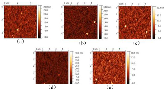 AFM images of PEDOT:PSS films with different exposure times of (a) 0 min; (b) 15 min; (c) 30 min; (d) 45 min; and (e) 60 min.