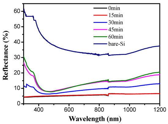 Reflection spectra of n-Si/PEDOT:PSS samples exposed to air for different time periods from 0 to 60 min; the reflection spectrum of the polished bare n-Si is also shown for a reference.