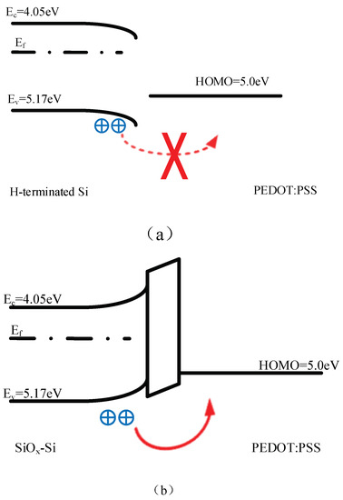 The energy band diagram of the (a) H-Si/PEDOT:PSS and (b) SiOx-Si/PEDOT:PSS hybrid heterojunctions.