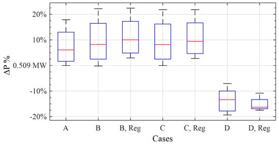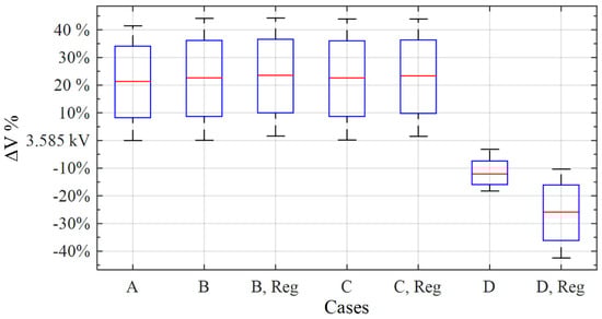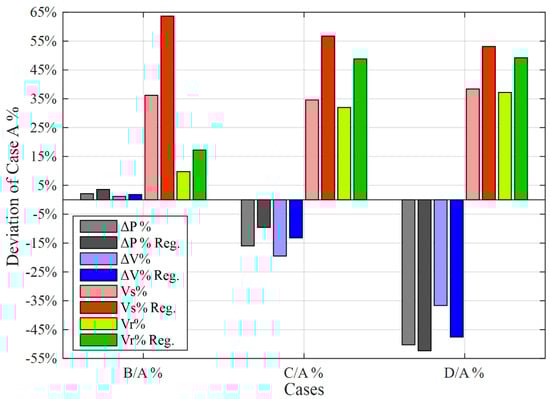 - (Case D/Case A)%: Power losses decrease from (−50% to −53%) and the voltage drop observed was between (−36% to −47%). The sending voltage increases significantly from (38% to 53%). Additionally, the receiving voltage increases from (37% to 48%). Overall, the performance after using the algorithm is far better than before using it.