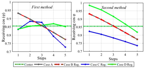 - For the first method: A fast decrease of receiving power factor for Case A and B is observed as shown in Figure 10. It can equally be seen from the figure that the power factor observed in case C is much worse than that of case A and B. The best situation observed is that of case D, the power factor is stable and close values were obtained for all steps monitored.