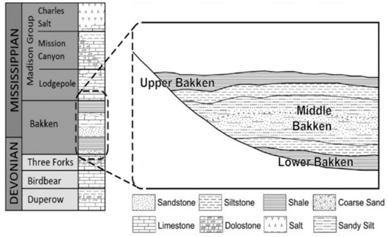 The late Devonian-Early Mississippian Bakken Formation is one of the main source rocks of the Williston Basin [29,30,31]. The Williston Basin is covers the southern portion of Canada (Manitoba and Saskatchewan) and the northern part of the United States (Montana and North Dakota), Figure 1. The Bakken Formation is underlain by the Three Forks Formation and is overlain by the Lodgepole Formation. The Bakken as an organic rich formation consists upper and lower members serving as source rocks and middle member as the reservoir with low porosity and permeability. Thickness of the Bakken Formation is about 150 ft and has no surface outcrop. The Bakken Formation has high TOC (Total Organic Carbon) content, which ranges from 5 to 20 wt % with an average of 11.33 wt % across the basin [32,33,34]. Different literature showed that most abundant kerogen type in the Bakken Formation are types I and II [35,36,37].