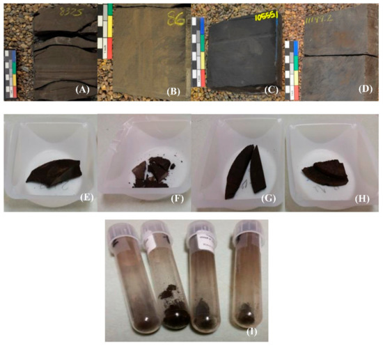 (A–D) Core samples of Wells A–D; (E–H) corresponding sample chips; and, (I) extracted kerogen.
