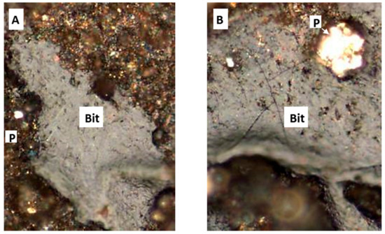 To evaluate the maturity of samples, they were crushed (850 µm) and hardened by mixing with the epoxy resin [4]. In the next step, to ensure the surfaces are scratch, samples were polished by polishing equipment. The random reflectance (%VRo) and qualitative fluorescence were then analyzed with a Carl Zeiss Axio imager A2m microscope. As primary vitrinite is absent in sedimentary formations that are older than the Devonian, the same as in four samples from Bakken Formation (Figure 3), bitumen reflectance (%BRo) was used to obtain an equivalent vitrinite maturity (%VRo-eq) using the Jacob equation (Equation (1)) [38], which is one of numerous such equations available. In addition, VRo-eq was calculated by converting Tmax from Rock-Eval pyrolysis through Equation (2) [39]. Equation (2) was used because it is derived from the Mississippian-age Barnett Shale in Texas, which contains type II marine kerogen, similar to that found in the Bakken Shale.