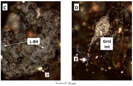 (A) Blocky grain of primary bitumen (Bit); (B) Same as (A) but Pyrite (P) is also visible; (C) Low-reflecting bitumen (L-Bit); and, (D) Granular inertinite (Grnl Int); Pyrite (P) is also visible. No reliable grain of primary vitrinite can be seen.