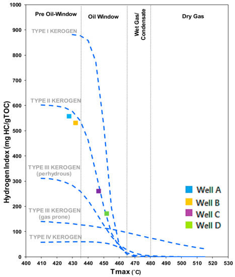 Hydrogen index (HI) vs. Tmax as pseudo-Van Krevelen diagram for kerogen typing.