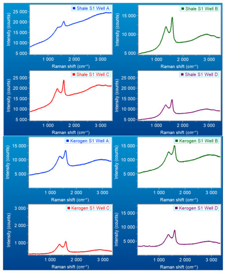 Previous studies have documented that thermal maturity reflects a systematic change in the positions, separations, and other important parameters of the bands in the Raman spectra for carbonaceous materials. As kerogen matures, it starts to make clusters of aromatic bands and also loses its heteroatoms [12,13,14]. Such evolution is perceived by Raman spectroscopy at different levels of maturation, reflecting molecular structural transformations.