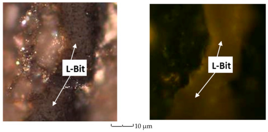 (Left) (L-Bit) Hydrogen-rich Solid bitumen under reflected (white) light; and (Right) The same view under fluorescence.