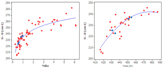 Figure 8 displays a non-linear correlation between band separation (G-D) versus maturity (%VRo) for samples that are taken from 12 different fields from [5,15,53], and including samples from this study. Tmax, which is also a major parameter representing the thermal maturity of the samples and is obtained from Rock-Eval analysis, shows correlation with band separation, as in earlier studies [15,17,26,27,40,54,55,56].