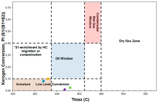 In addition to understanding the thermal maturity of organic matter, its production potential regarding Rock-Eval parameters, such as S1, S2, and production index (PI) is also important in evaluating productive intervals. As mentioned before, S1 is the amount of free hydrocarbons (oil) already in the sample (in milligrams of hydrocarbon per gram of rock), which can be detected at 350 °C (initial heating stage) [10,58]. S2 is the quantity of hydrocarbons that will be generated through pyrolysis (550 °C). Production index is the ratio of generated hydrocarbons to potential hydrocarbons that can be produced, Equation (3) [59,60], which can give an insight about the kerogen conversion level when is plotted vs. Tmax. Figure 9 shows that our samples are in a low level of conversion stage.