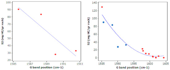 The origin of the G is due to the in-plane E2g vibrational modes of the carbon atoms in aromatic ring structures [5,26,27,28,77]. If the structure of organic matter has high aromatic content, it is corresponding to less potential of hydrocarbon production, thus, S2 can be correlated to the G band as aromatic indicator, Figure 12. As mentioned earlier, it has been shown G band shifts slightly toward higher shifts by increasing maturity concurrent with the increase in aromaticity [15]. The negative correlation between S2 and the G band is a result of this matter.