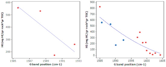 Furthermore, the abundance of aromatic structures in conjunction with high maturity corresponds to lower hydrogen content [84], Figure 13. Therefore, HI (Hydrogen Index) could be correlated with G band position, Figure 13.